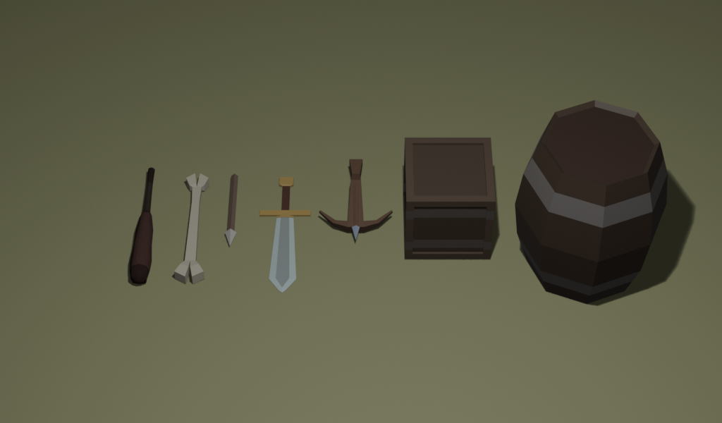 - 7 weapons and misc.(Sword, Crossbow, Bone Club, Stone Club, Wooden Crate, Wooden Barrel, Arrow).